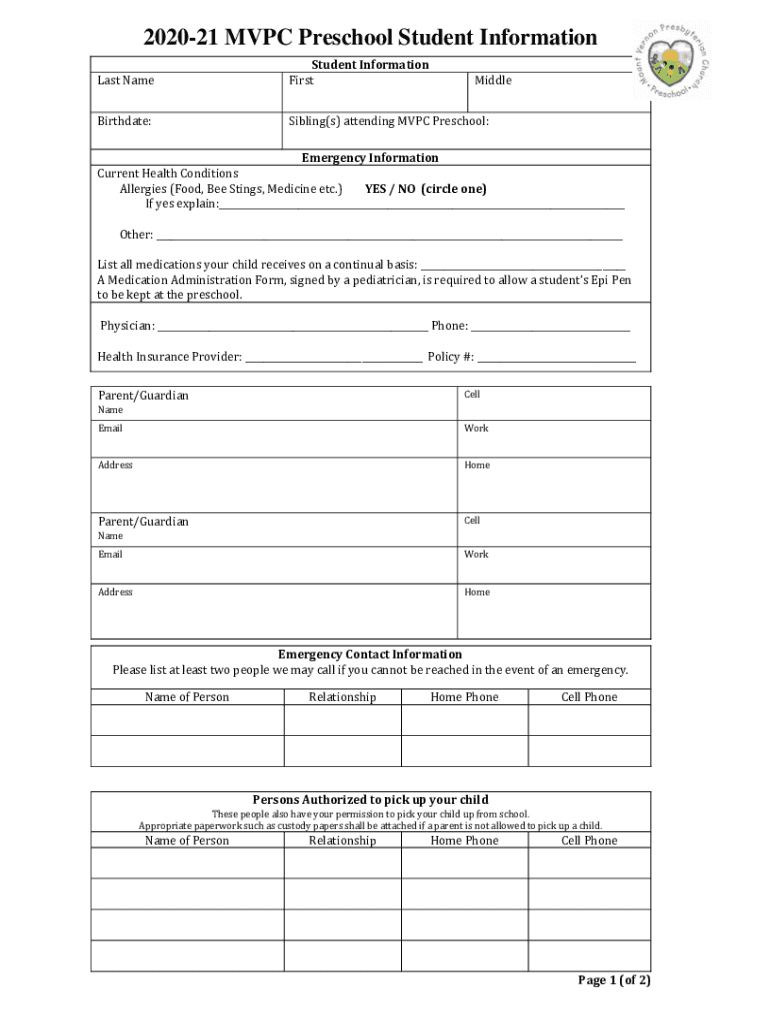 202021 MVP Preschool Student Information Last NameStudent Information FirstBirthdate:Sibling(s) attending MVP Preschool:MiddleEmergency Information Current Health Conditions Allergies (Food, Bee Stings,