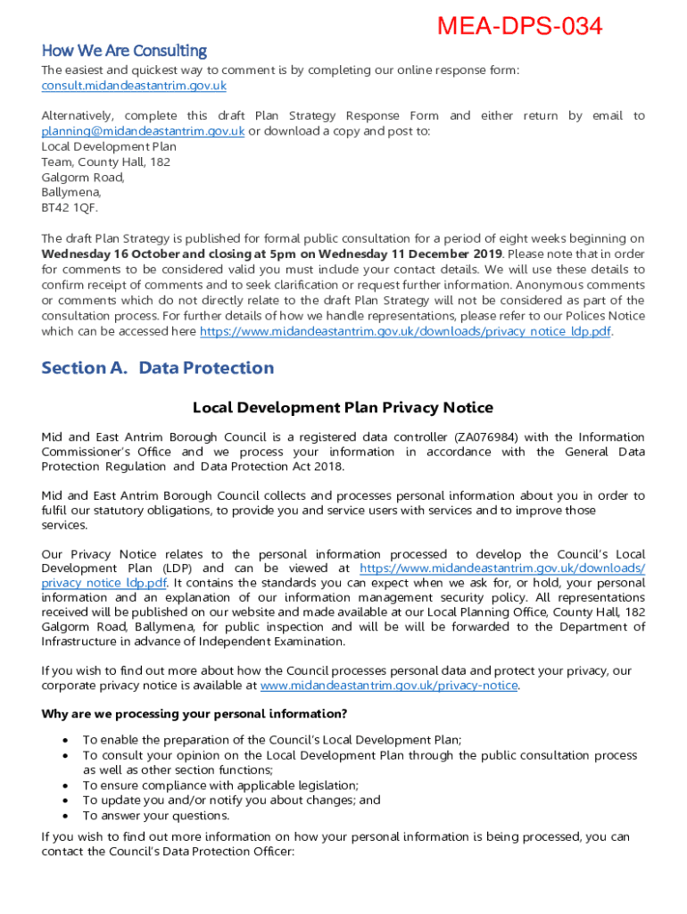 MEADPS034 How We Are Consulting The easiest and quickest way to comment is by completing our online response form: consult.midandeastantrim.gov.UK Alternatively, complete this draft Plan Strategy