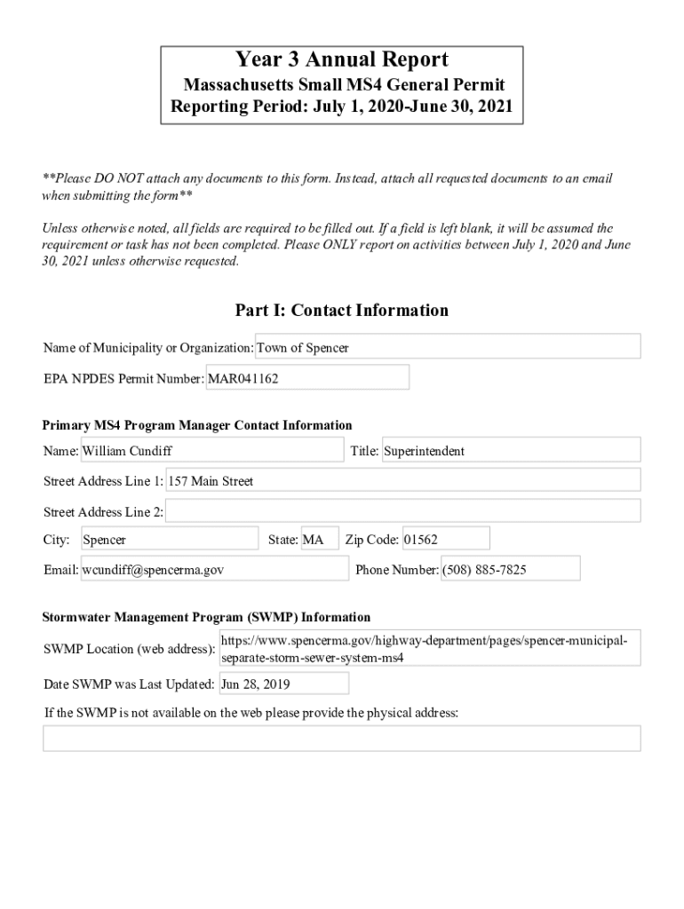 Year 3 Annual Report Massachusetts Small MS4 General Permit Reporting Period: July 1, 2020June 30, 2021**Please DO NOT attach any documents to this form. Instead, attach all requested documents to