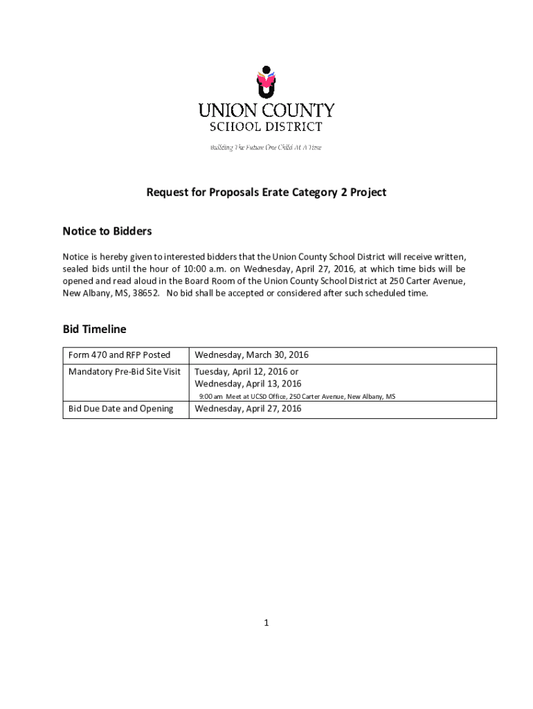 RequestforProposalsErateCategory2Project NoticetoBidders Notice is hereby given tointerestedbiddersthattheUnionCounty SchoolDistrict willreceivewritten, sealed bids until the hour of 10:00 a.m. on