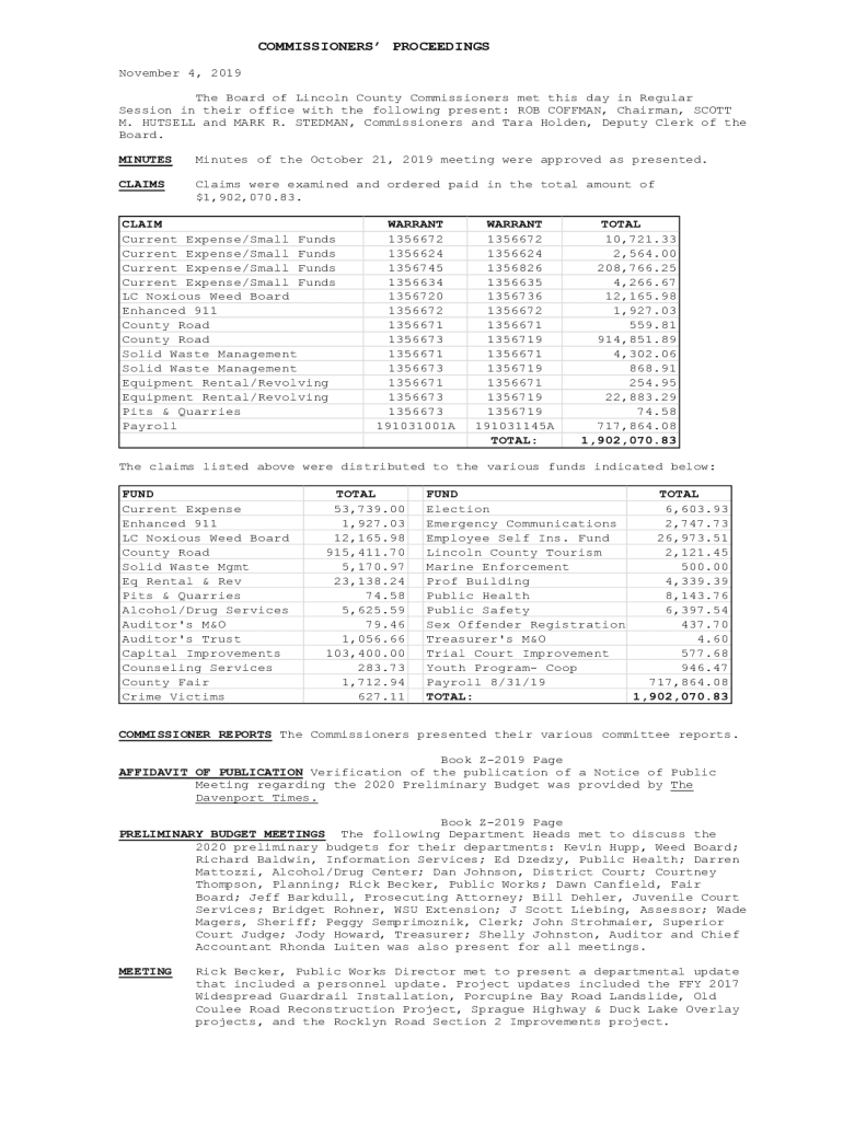 COMMISSIONERS PROCEEDINGS November 4, 2019, The Board of Lincoln County Commissioners met this day in Regular Session in their office with the following present: ROB HOFFMAN, Chairman, SCOTT M. OUTSELL