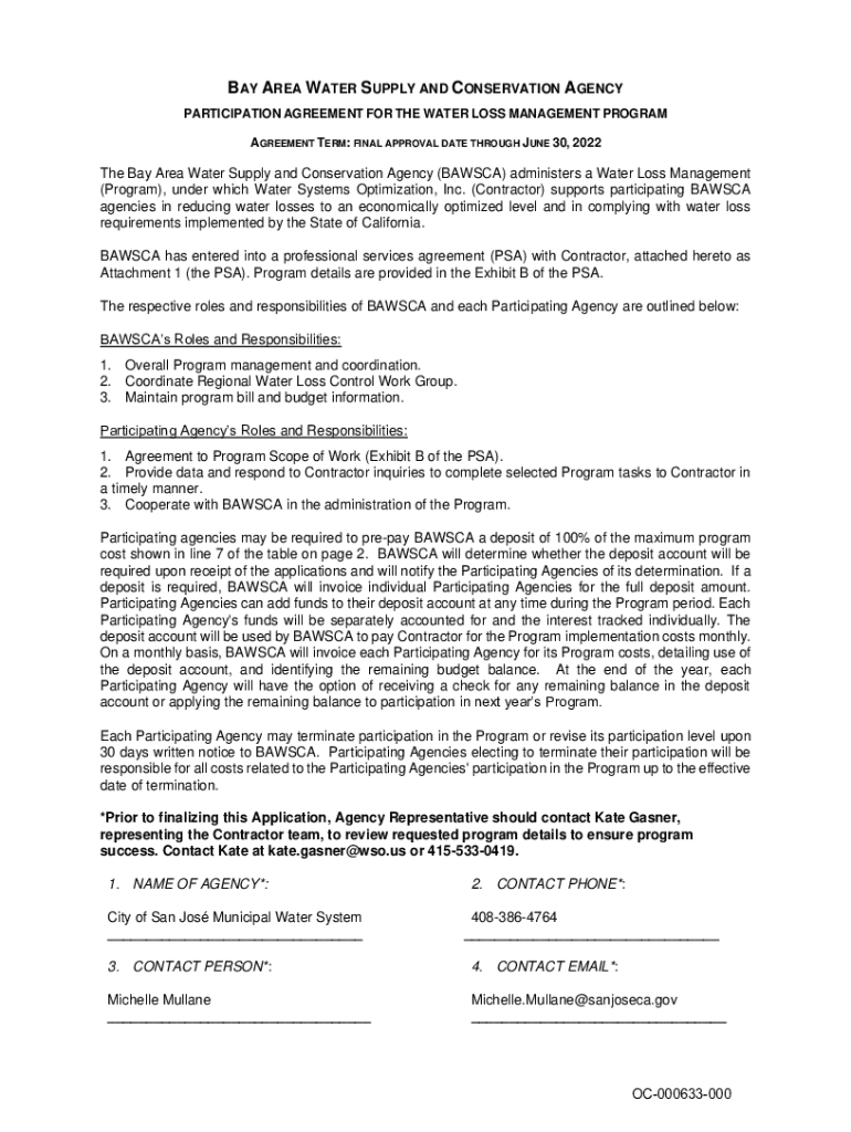 BAY AREA WATER SUPPLY AND CONSERVATION AGENCY PARTICIPATION AGREEMENT FOR THE WATER LOSS MANAGEMENT PROGRAM AGREEMENT TERM: FINAL APPROVAL DATE THROUGH JUNE 30, 2022The Bay Area Water Supply and Conservation