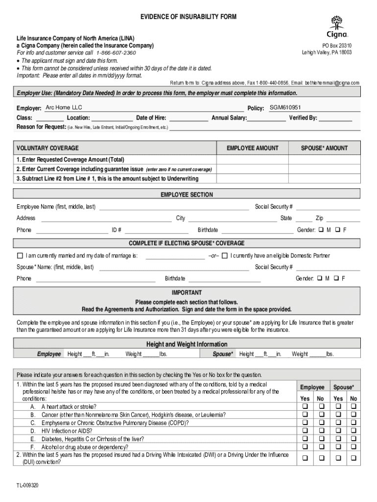 EVIDENCE OF INSURABILITY FORM Life Insurance Company of North America (LINA) a Cagney Company (herein called the Insurance Company) For info and customer service call 18666072360 The applicant must