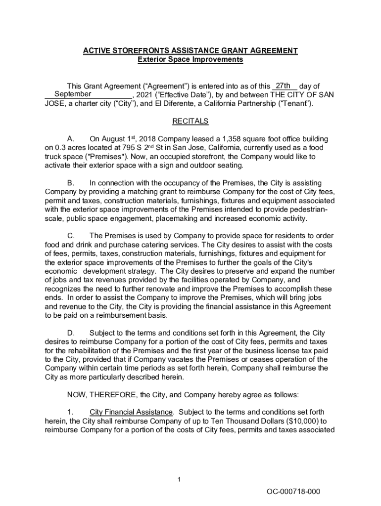 Get the free active storefronts assistance grant agreement - City of San Jose
