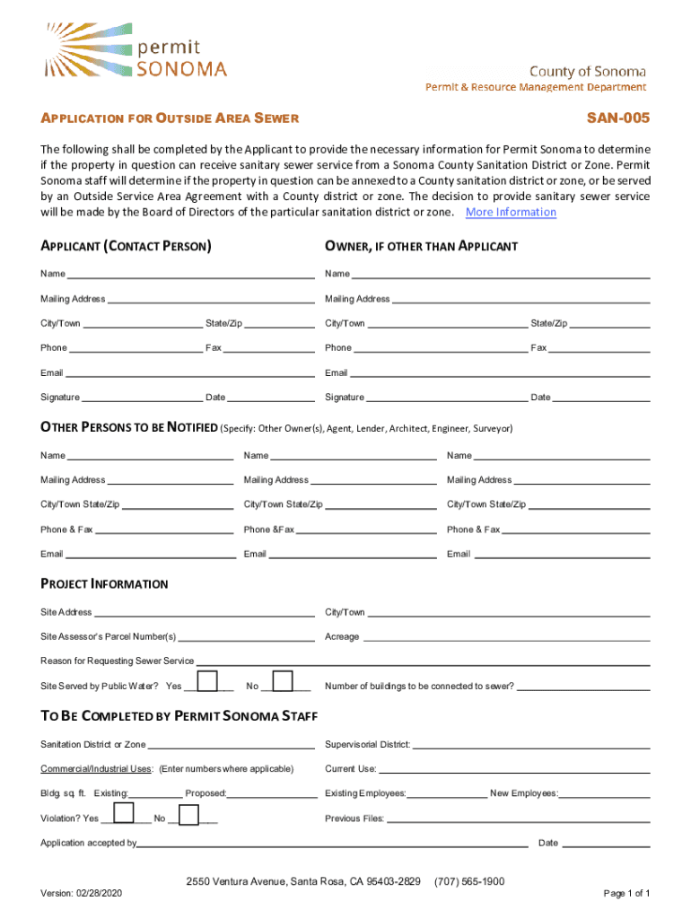 APPLICATION FOR OUTSIDE AREA SEWERSAN005The following shall be completed by the Applicant to provide the necessary information for Permit Sonoma to determine if the property in question can receive