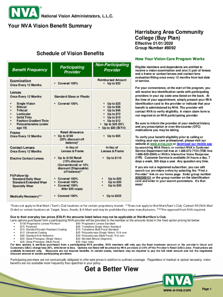 National Vision Administrators, L.L.C. Your NVA Vision Benefit Summary Harrisburg Area Community College (Buy Plan) Effective 01/01/2020 Group Number #8092Schedule of Vision Benefits How Your Vision