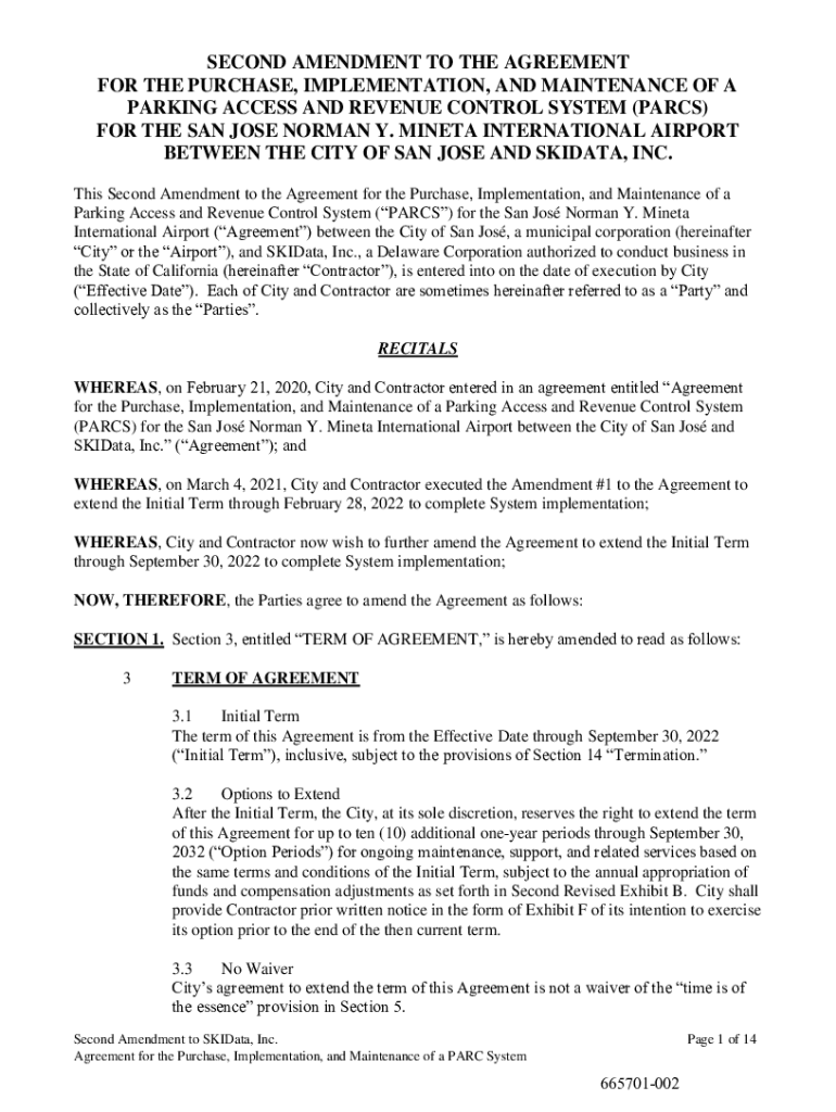 SECOND AMENDMENT TO THE AGREEMENT FOR THE PURCHASE, IMPLEMENTATION, AND MAINTENANCE OF A PARKING ACCESS AND REVENUE CONTROL SYSTEM (PARCs) FOR THE SAN JOSE NORMAN Y. MIN ETA INTERNATIONAL AIRPORT