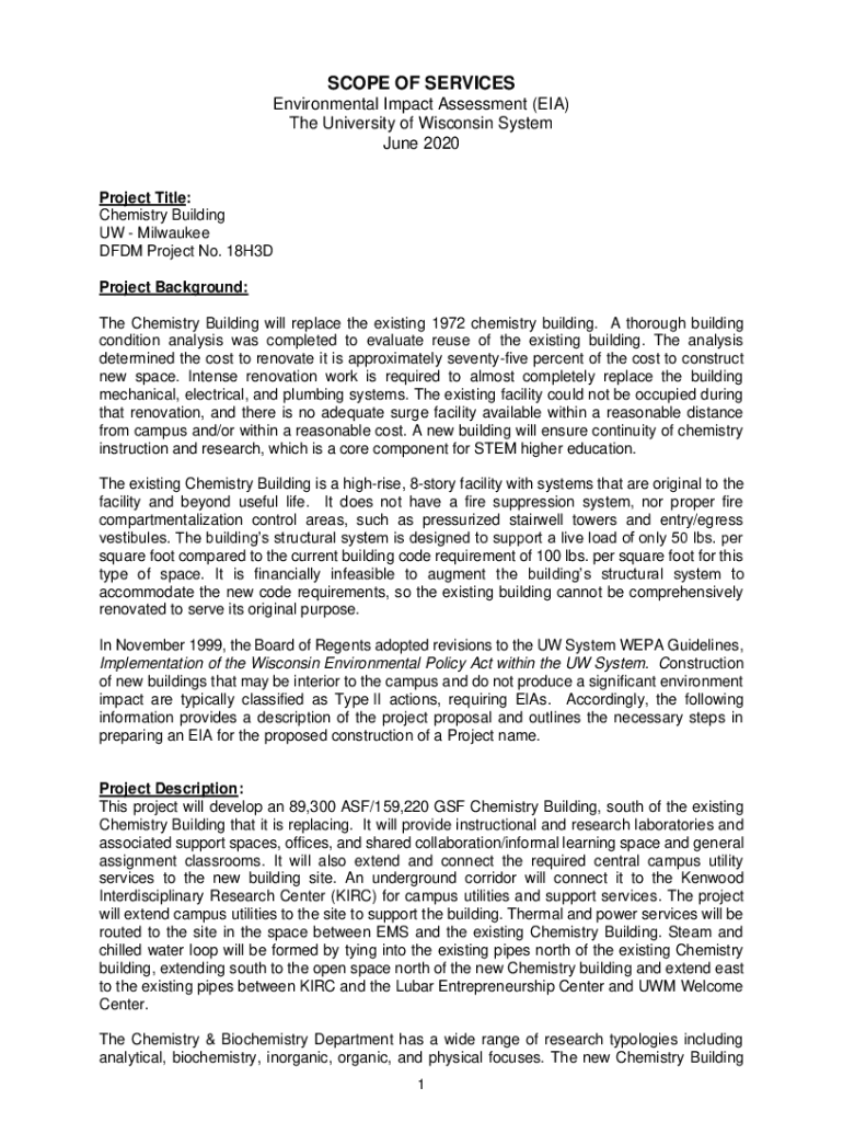 SCOPE OF SERVICES Environmental Impact Assessment (EIA) The University of Wisconsin System June 2020 Project Title: Chemistry Building UW Milwaukee AFDM Project No. 18H3D Project Background: The Chemistry