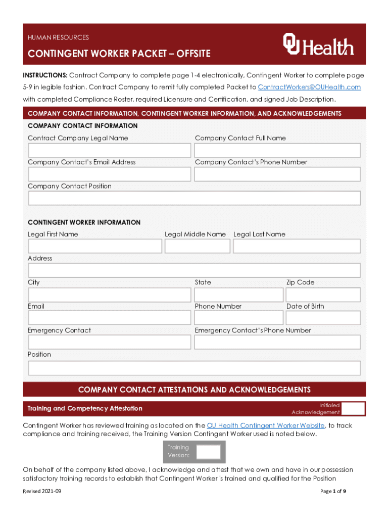 HUMAN RESOURCESCONTINGENT WORKER PACKET OFFSITE INSTRUCTIONS: Contract Company to complete page 14 electronically, Contingent Worker to complete page 59 in legible fashion. Contract Company to remit