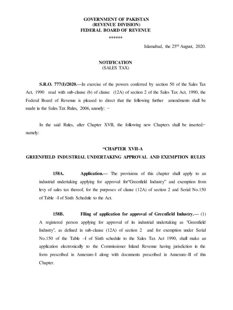GOVERNMENT OF PAKISTAN (REVENUE DIVISION) FEDERAL BOARD OF REVENUE ****** Islamabad, the 25th August 2020.NOTIFICATION (SALES TAX)S.R.O. 777(I)/2020. In exercise of the powers conferred by section