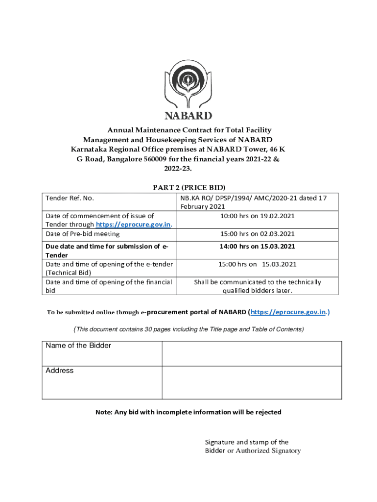 Annual Maintenance Contract for Total Facility Management and Housekeeping Services of NAB ARD Karnataka Regional Office premises at NAB ARD Tower, 46 K G Road, Bangalore 560009 for the financial