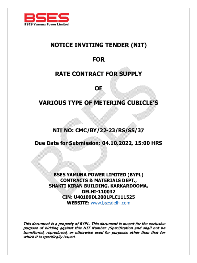 NOTICE INVITING TENDER (NIT) FOR RATE CONTRACT FOR SUPPLY OF VARIOUS TYPE OF METERING CUBICLES NO: CMC/BY/2223/RS/SS/37 Due Date for Submission: 04.10.2022, 15:00 HISSES FAUNA POWER LIMITED (BPL)