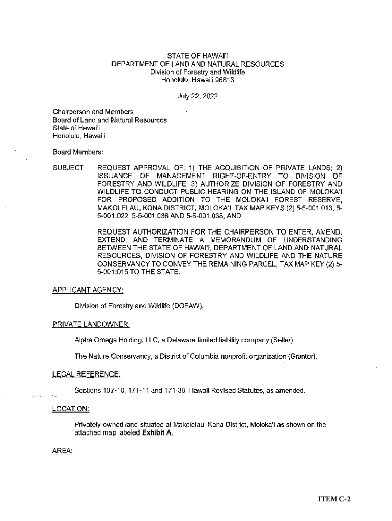 STATE OF Hawaii DEPARTMENT OF LAND AND NATURAL RESOURCES Division of Forestry and Wildlife Honolulu, Hawaii 96813 July 22, 2022, Chairperson and Members Board of Land and Natural Resources State of