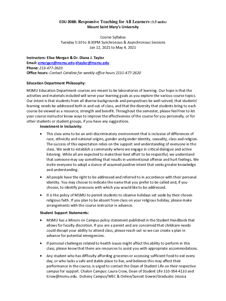 EDU 208B: Responsive Teaching for All Learners (1.5 units) Mount Saint Mary's University Course Syllabus Tuesday 5:30 to 8:30PM Synchronous & Asynchronous Sessions Jan 12, 2021 to May 4, 2021, Instructors: