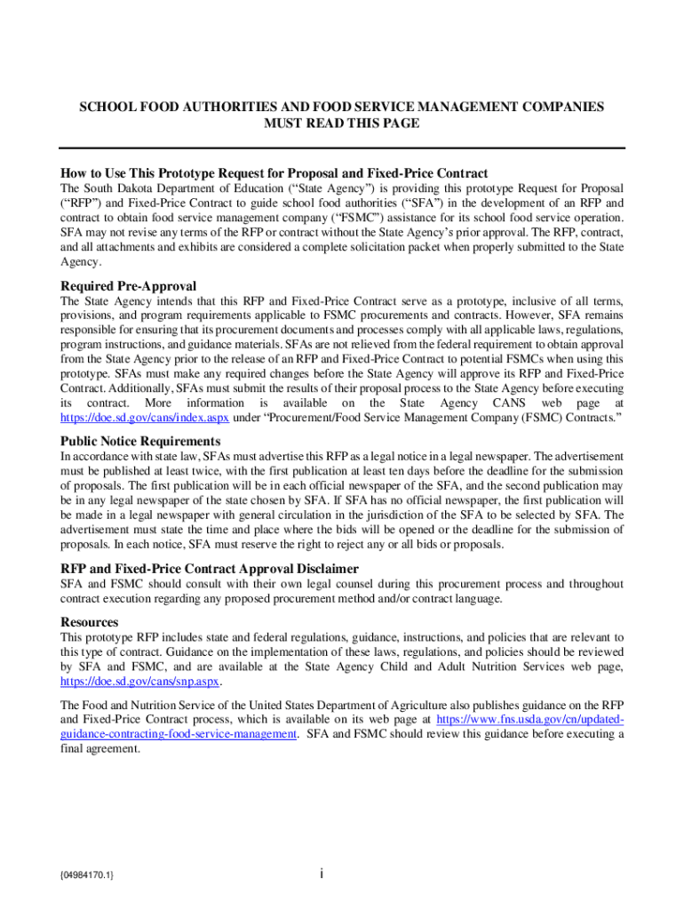 SCHOOL FOOD AUTHORITIES AND FOOD SERVICE MANAGEMENT COMPANIES MUST READ THIS Pageboy to Use This Prototype Request for Proposal and Fixed Price Contract The South Dakota Department of Education (State