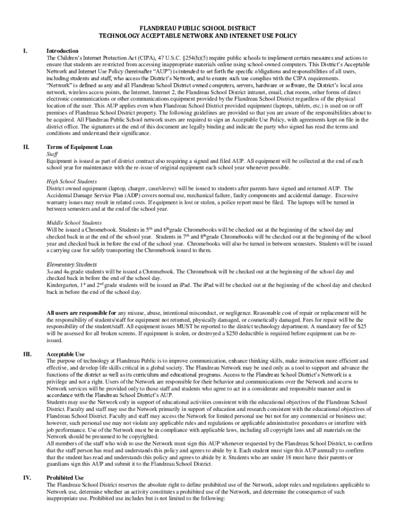 ANDREA PUBLIC SCHOOL DISTRICT TECHNOLOGY ACCEPTABLE NETWORK AND INTERNET USE POLICY I. Introduction The Children's Internet Protection Act (CIA), 47 U.S.C. 254(h)(5) require public schools to implement
