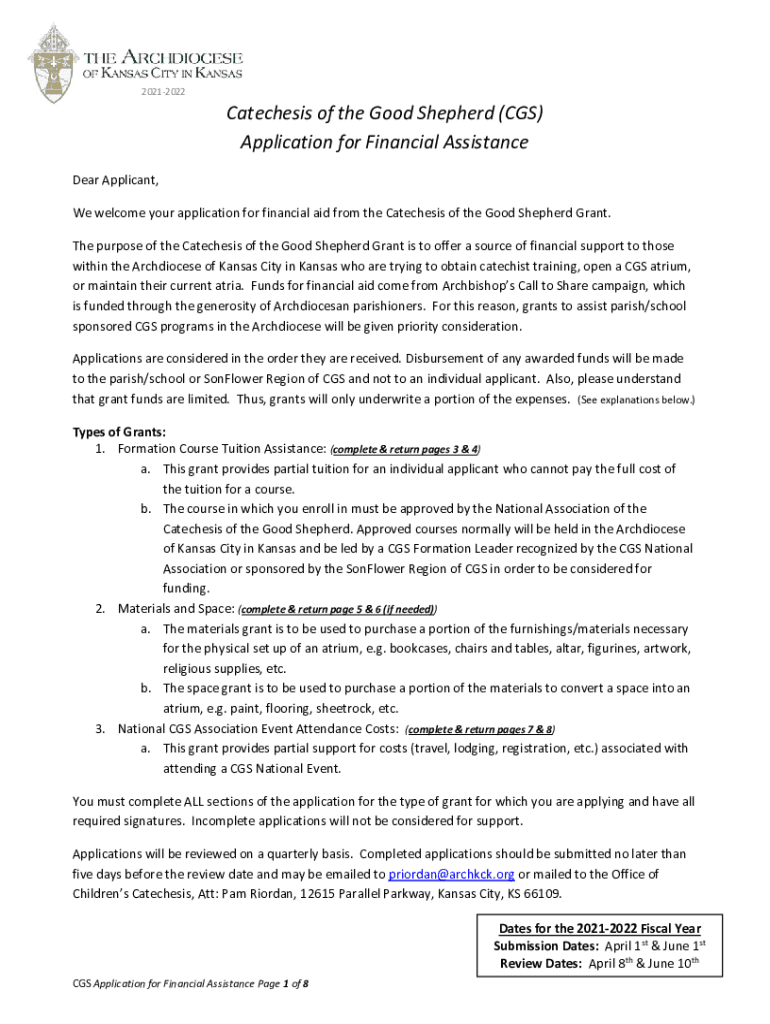 20212022Catechesis of the Good Shepherd (CGS) Application for Financial Assistance Dear Applicant, We welcome your application for financial aid from the Catechisms of the Good Shepherd Grant. The