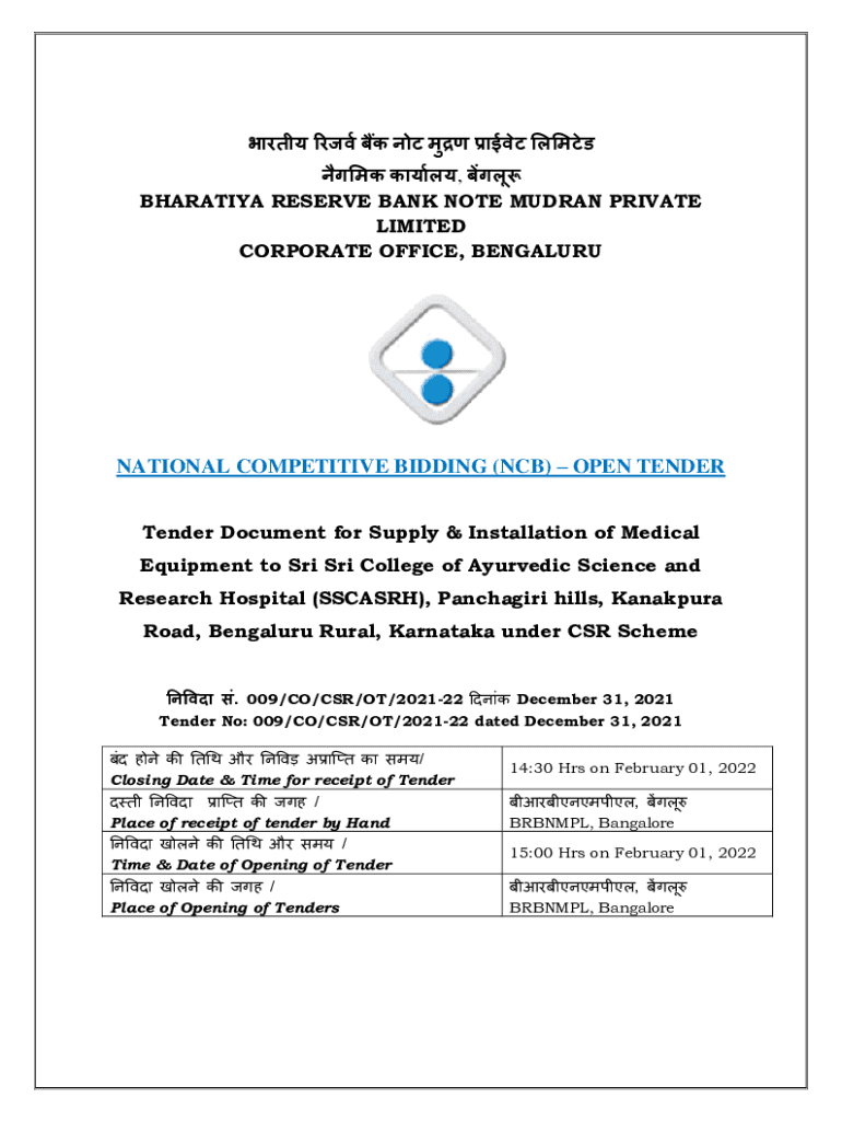CORPORATE OFFICE, BENGALURUNATIONAL COMPETITIVE BIDDING (NCB) OPEN TENDER Document for Supply & Installation of Medical