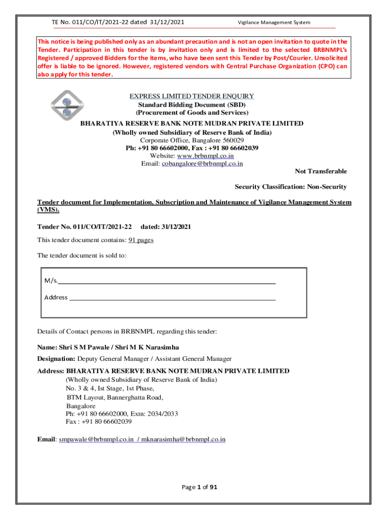 TE No. 011/CO/IT/202122 dated 31/12/2021Vigilance Management Systems notice is being published only as an abundant precaution and is not an open invitation to quote in the Tender. Participation in