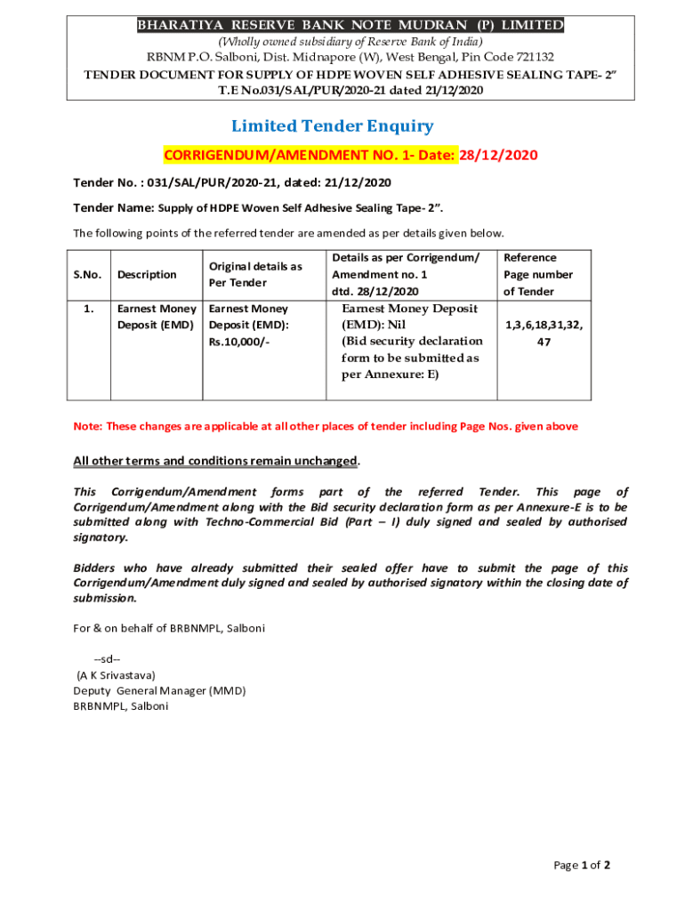 BHARAT RESERVE banknote MEDIAN (P) LIMITED (Wholly owned subsidiary of Reserve Bank of India) BNM P.O. Salmon, Dist. Singapore (W), West Bengal, Pin Code 721132 TENDER DOCUMENT FOR SUPPLY OF HDPE