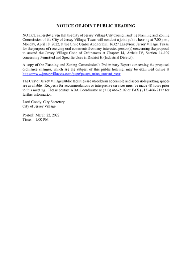 Get the free NOTICE OF JOINT PUBLIC HEARINGS - City of Jersey Village