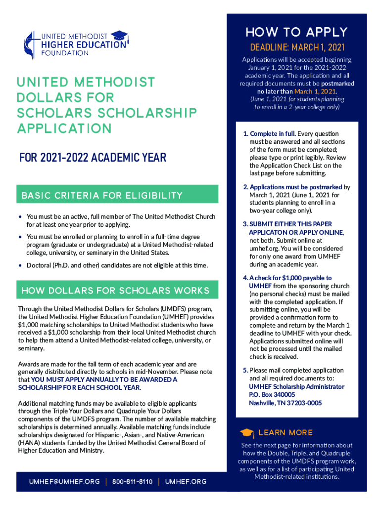 HOW TO APPLY DEADLINE: MARCH 1, 2021United Methodist Dollars for scholars scholarship application FOR 20212022 ACADEMIC YEAR BASIC CRITERIA FOR ELIGIBILITY You must be an active, full member of The