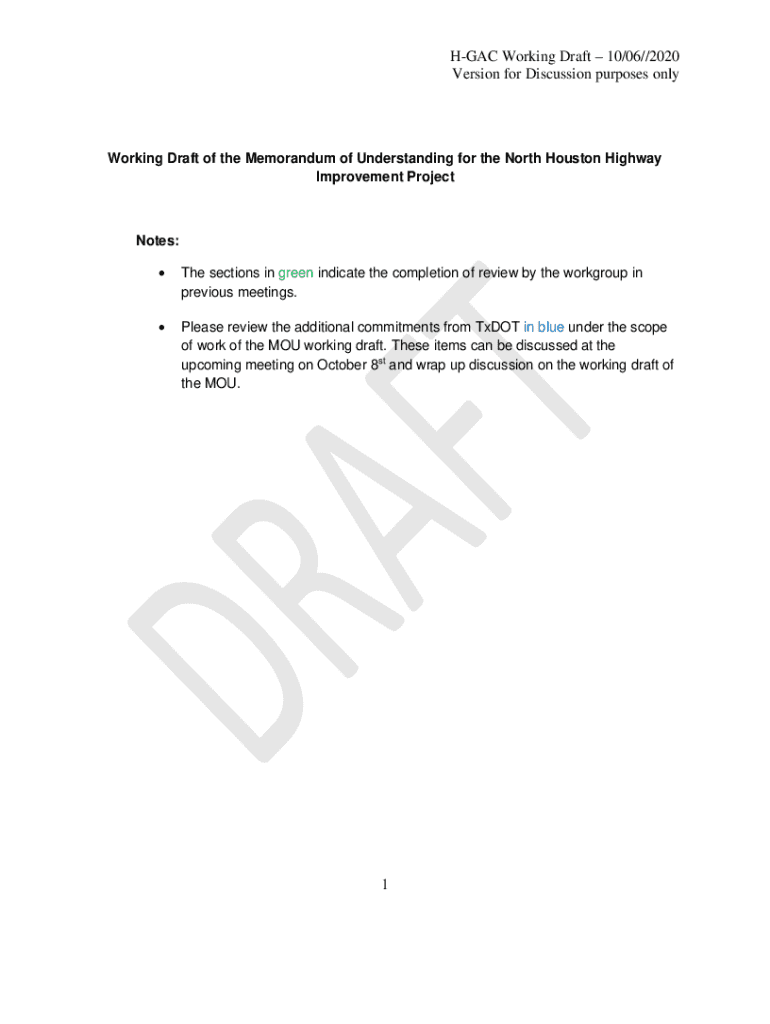 DGAC Working Draft 10/06//2020 Version for Discussion purposes networking Draft of the Memorandum of Understanding for the North Houston Highway Improvement Projections: The sections in green indicate