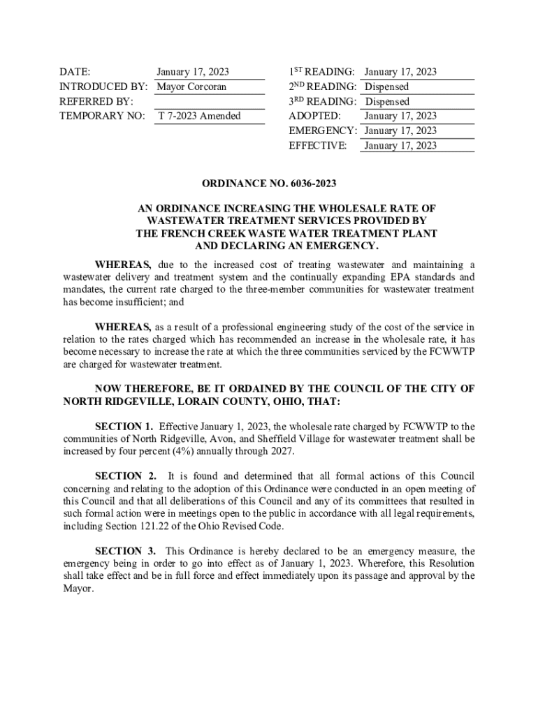 DATE: January 17, 2023, INTRODUCED BY: Mayor Corcoran REFERRED BY: TEMPORARY NO: T 72023 Amended1ST READING: 2ND READING: 3RD READING: ADOPTED: EMERGENCY: EFFECTIVE:January 17, 2023, Dispensed January