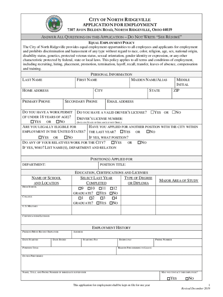 CITY OF NORTH RIDGEVILLE APPLICATION FOR EMPLOYMENT7307 AVON BEEN ROAD, NORTH RIDGEVILLE, OHIO 44039ANSWER ALL QUESTIONS ON THIS APPLICATION DO NOT WRITE SEER SUM EQUAL EMPLOYMENT POLICY The City