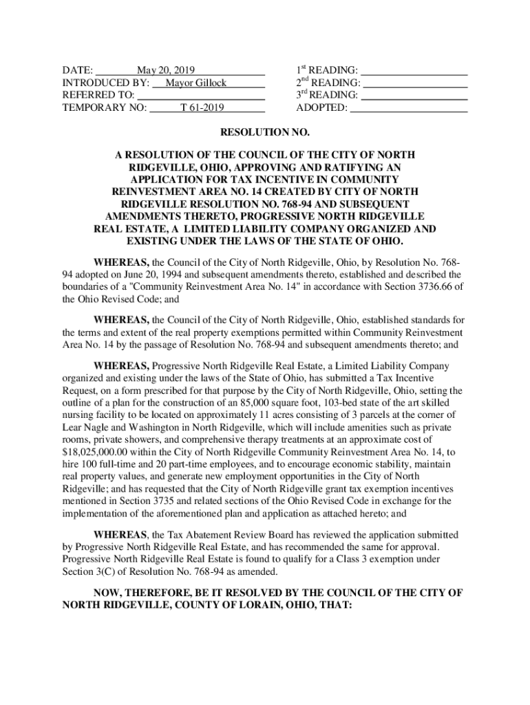 DATE: May 20, 2019, INTRODUCED BY: Mayor Hillock REFERRED TO: TEMPORARY NO: T 6120191st READING: 2nd READING: 3rd READING: ADOPTED:RESOLUTION NO. A RESOLUTION OF THE COUNCIL OF THE CITY OF NORTH RIDGEVILLE,