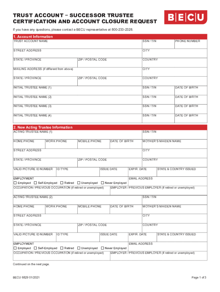 TRUST ACCOUNT SUCCESSOR TRUSTEE CERTIFICATION AND ACCOUNT CLOSURE REQUEST If you have any questions, please contact a BEAU representative at 8002332328.1. Account Information TRUST ACCOUNT NAMES SN