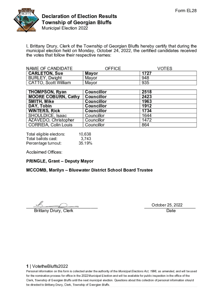 Form EL28Declaration of Election Results Township of Georgian Bluffs Municipal Election 2022I, Brittany Drug, Clerk of the Township of Georgian Bluffs hereby certify that during the municipal election