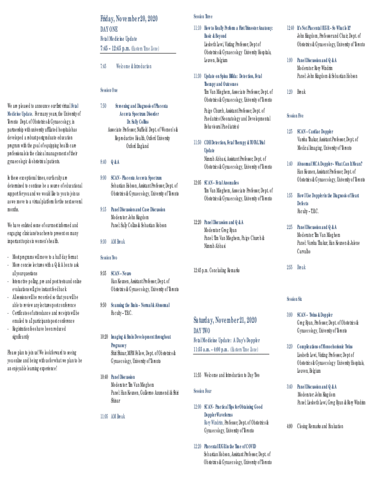 Friday, November 20, 2020, DAY Obsession Three 11:10Fetal Medicine Update7:45 12:45 p.m. (Eastern Time Zone) 7:45Welcome & Introduction 11:30Session One We are pleased to announce our first virtual