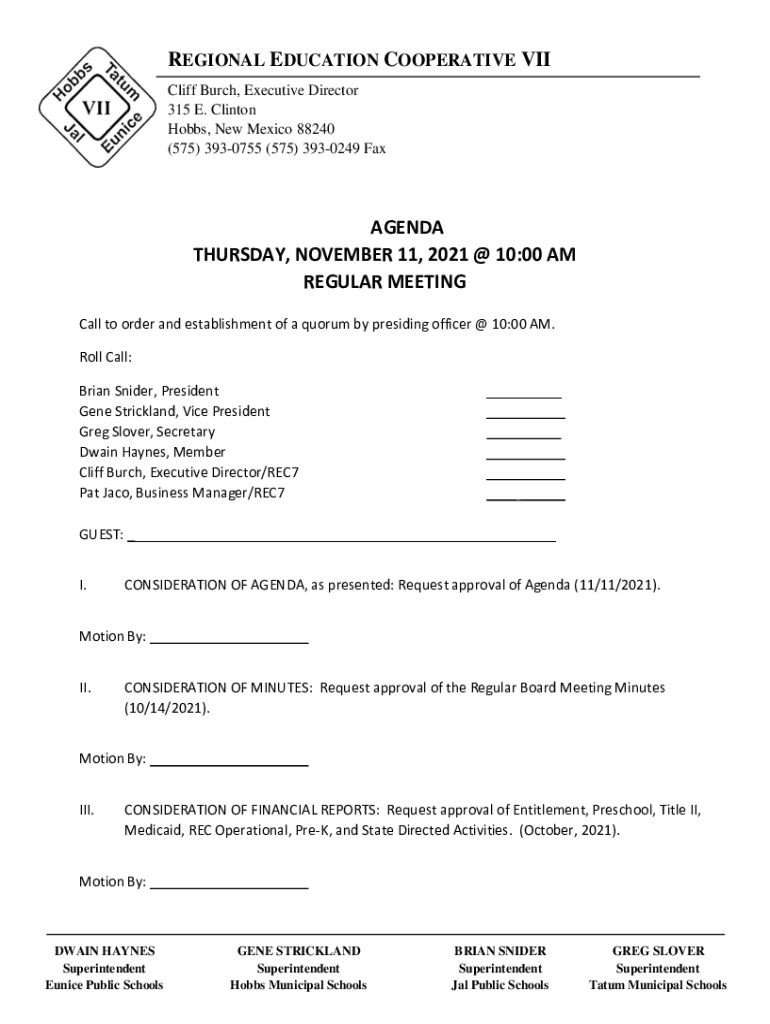 REGIONAL EDUCATION COOPERATIVE VII Cliff Burch, Executive Director 315 E. Clinton Hobbs, New Mexico 88240 (575) 3930755 (575) 3930249 Agenda THURSDAY, NOVEMBER 11, 2021 @ 10:00 AM REGULAR MEETING