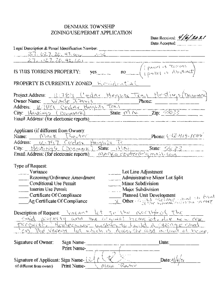 DENMARK TOWNSHIP ZONINGfUSEIPERMIT APPLICATION Date Received: Date Accepted:_Legal Description & Parcel Identification Number: _, OLD. 20. L...3. L;. L/_, d.2 yetis THIS TORRENS PROPERTY:PROPERTY