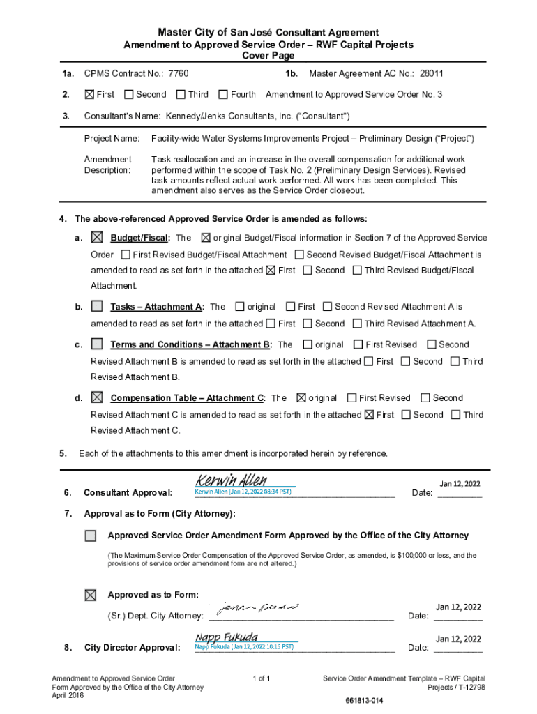 Master City of San Jo's Consultant Agreement Amendment to Approved Service Order RWF Capital Projects Cover Page 1a. CPMs Contract No.: 77602. First3. Second1b. ThirdFourthMaster Agreement AC No.:
