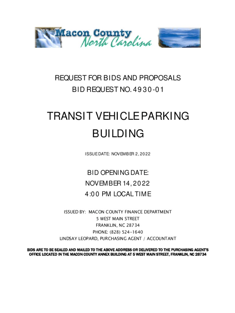 REQUEST FOR BIDS AND PROPOSALS BID REQUEST NO. 493001TRANSIT VEHICLE PARKING BUILDING ISSUE DATE: NOVEMBER 2, 2022BID OPENING DATE: NOVEMBER 14, 2022 4:00 PM LOCAL TIME ISSUED BY: MACON COUNTY FINANCE