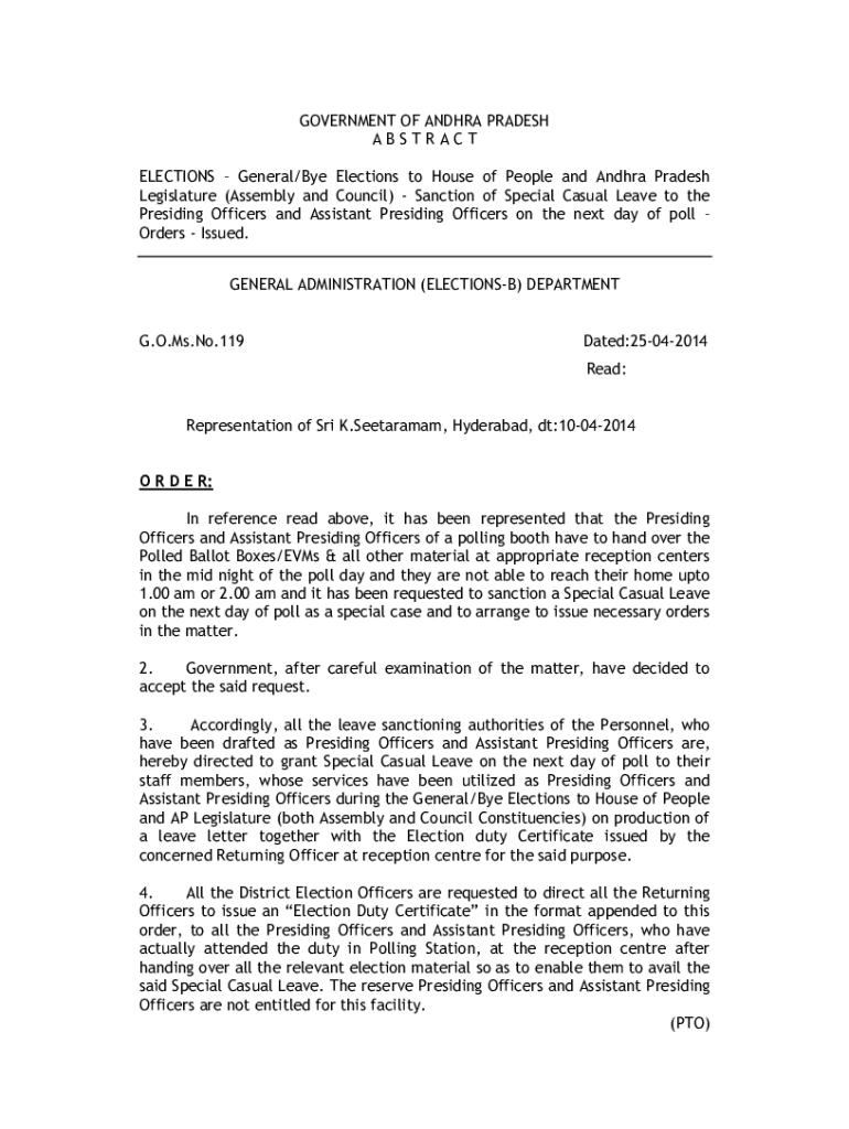 GOVERNMENT OF ANDHRA PRADESH ABSTRACT ELECTIONS General/Bye Elections to House of People and Andhra Pradesh Legislature (Assembly and Council) Sanction of Special Casual Leave to the Presiding Officers