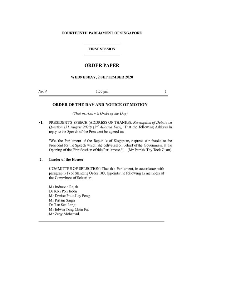 FOURTEENTH PARLIAMENT OF SINGAPORE___ FIRST SESSION ___ORDER PAPER WEDNESDAY, 2 SEPTEMBER 20201.00 PMN. 41ORDER OF THE DAY AND NOTICE OF MOTION (That marked is Order of the Day) 1.PRESIDENT\'S SPEECH