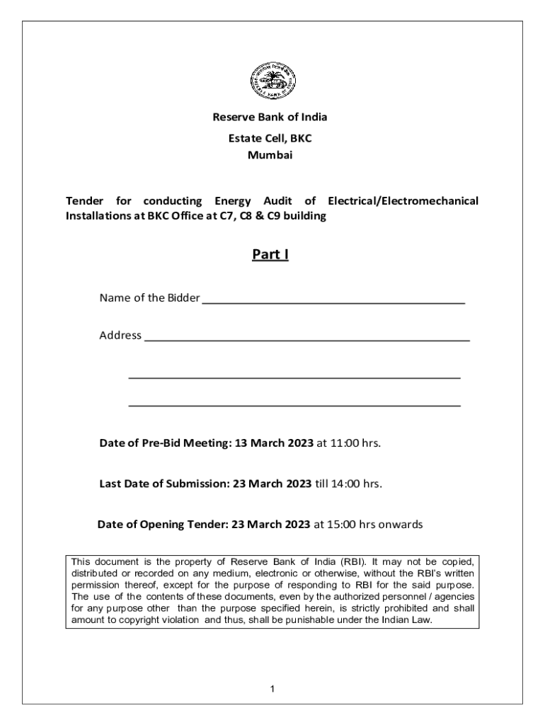 Reserve Bank of India Estate Cell, BKC MumbaiTender for conducting Energy Audit of Electrical/Electromechanical Installations at BKC Office at C7, C8 & C9 buildingPart I Name of the Bidder Addressable