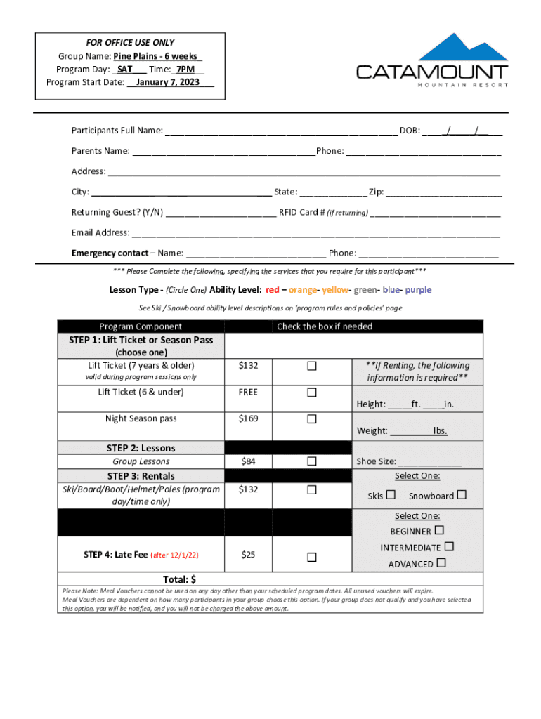 FOR OFFICE USE ONLY Group Name: Pine Plains 6 weeks_ Program Day: _SAT___ Time:_7PM__ Program Start Date: __January 7, 2023___Participants Full Name: ___ DOB: ___/___/___ Parents Name: ___Phone: ___