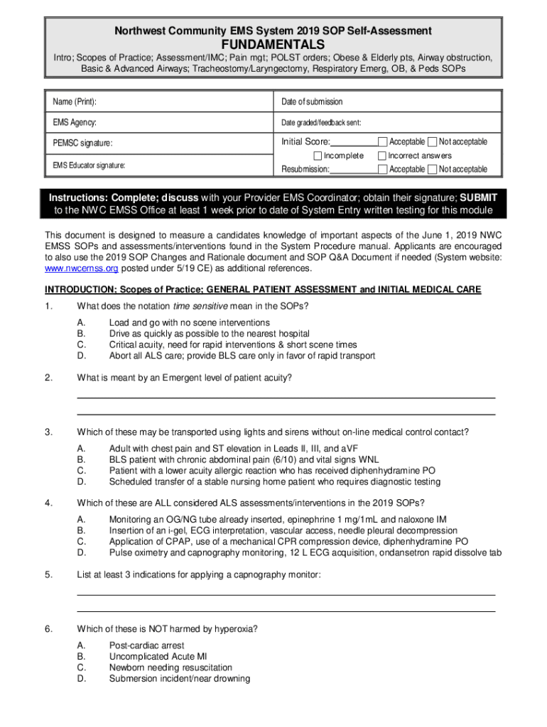 Northwest Community EMS System 2019 SOP SelfAssessmentFUNDAMENTALS Intro; Scopes of Practice; Assessment/IMC; Pain met; POST orders; Obese & Elderly pts, Airway obstruction, Basic & Advanced Airways;