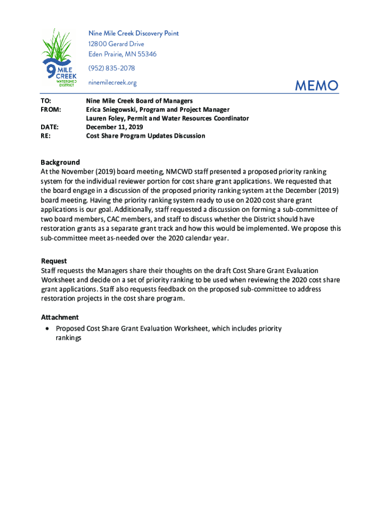 Nine Mile Creek Discovery Point 12800 Gerard Drive Eden Prairie, MN 55346 (952) 8352078 ninemilecreek.org TO: FROM: DATE: RE:Nine Mile Creek Board of Managers Erica Sniegowski, Program and Project