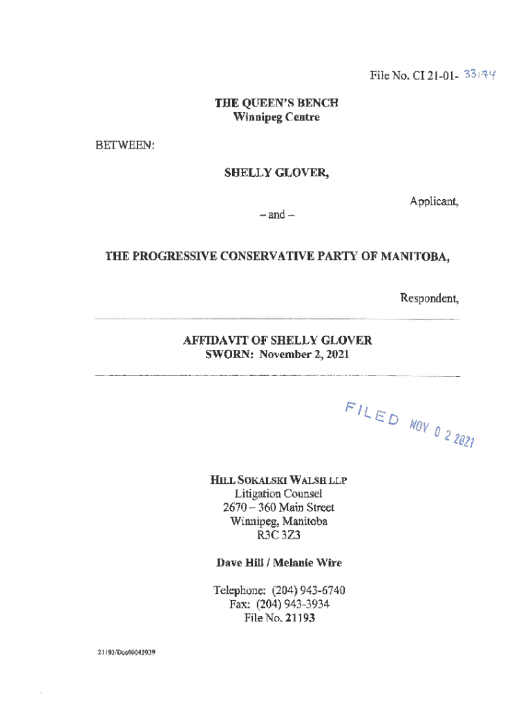 Fi1eN0. C121o1THE?3|Queen's BENCH Winnipeg CentreBETWEEN:SHELLY GLOVER, applicant,