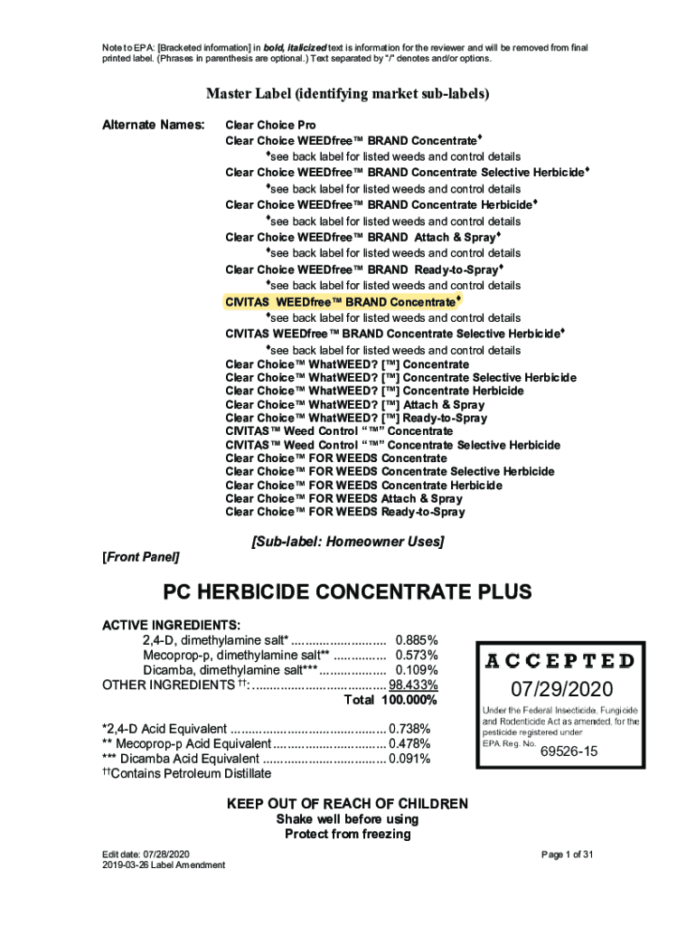 Note to EPA: [Bracketed information] in bold, italicized text is information for the reviewer and will be removed from final printed label. (Phrases in parentheses are optional.) Text separated by