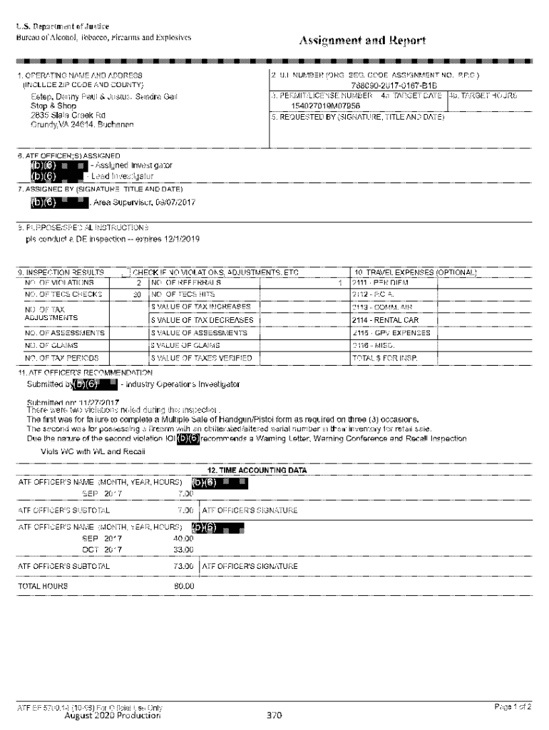 U.S. Department of Justice Bureau of Alcohol. Tobacco, Firearms and ExplosivesAssignment and Report 2. U.I. NUMBER (ORG. SEG. CODE, ASSIGNMENT NO., P.P.G.)1. OPERATING NAME AND ADDRESS (INCLUDE ZIP