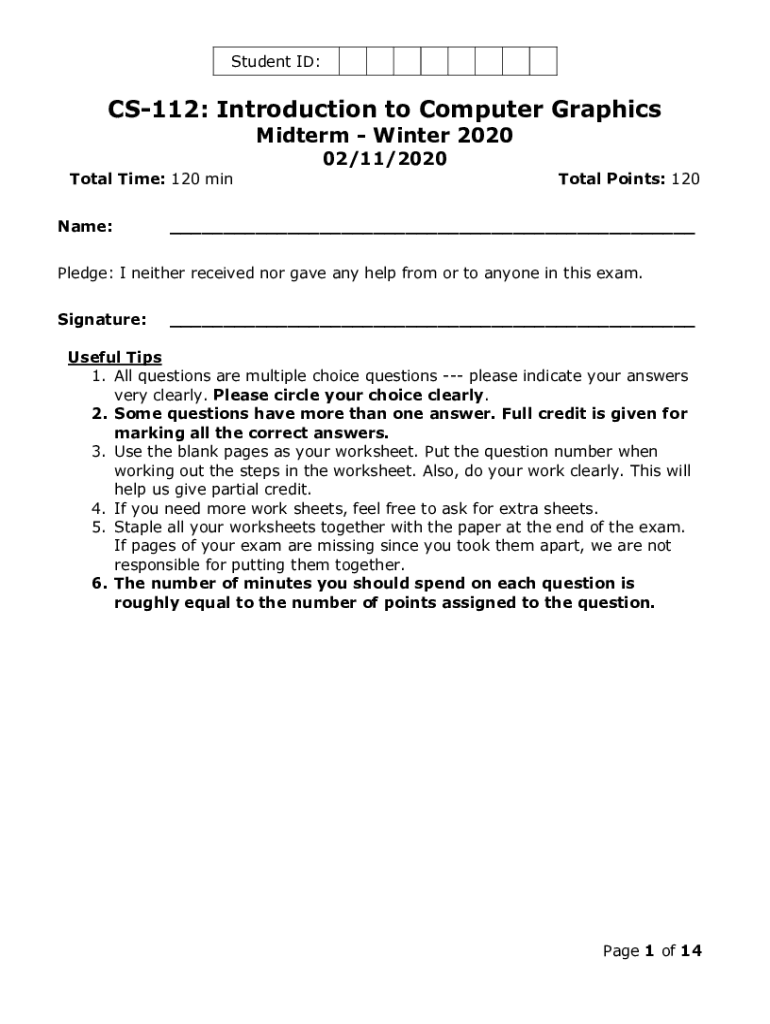 Student ID:CS112: Introduction to Computer Graphics Midterm Winter 2020 02/11/2020 Total Time: 120 min Name:Total Points: 120___Pledge: I neither received nor gave any help from or to anyone in this
