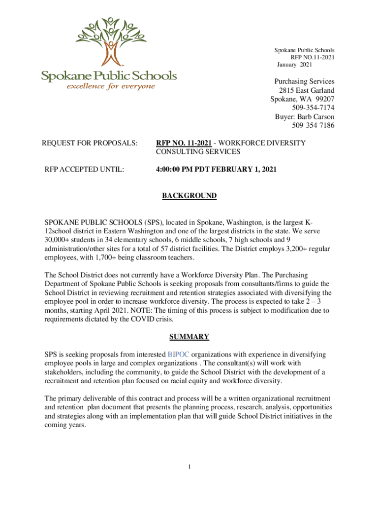 Spokane Public Schools RFP NO.112021 January 2021Purchasing Services 2815 East Garland Spokane, WA 99207 5093547174 Buyer: Barb Carson 5093547186 REQUEST FOR PROPOSALS:RFP ACCEPTED UNTIL:RFP NO. 112021