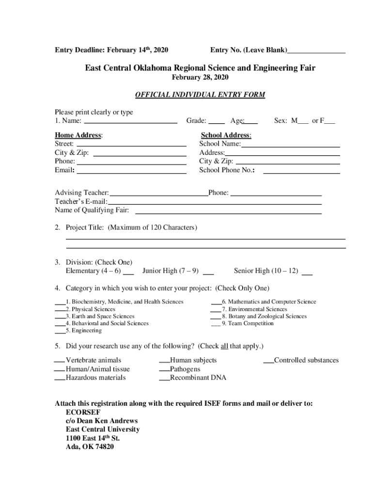 Entry Deadline: February 14th, 2020Entry No. (Leave Blank)___East Central Oklahoma Regional Science and Engineering Fair February 28, 2020, OFFICIAL INDIVIDUAL ENTRY FORM Please print clearly or type