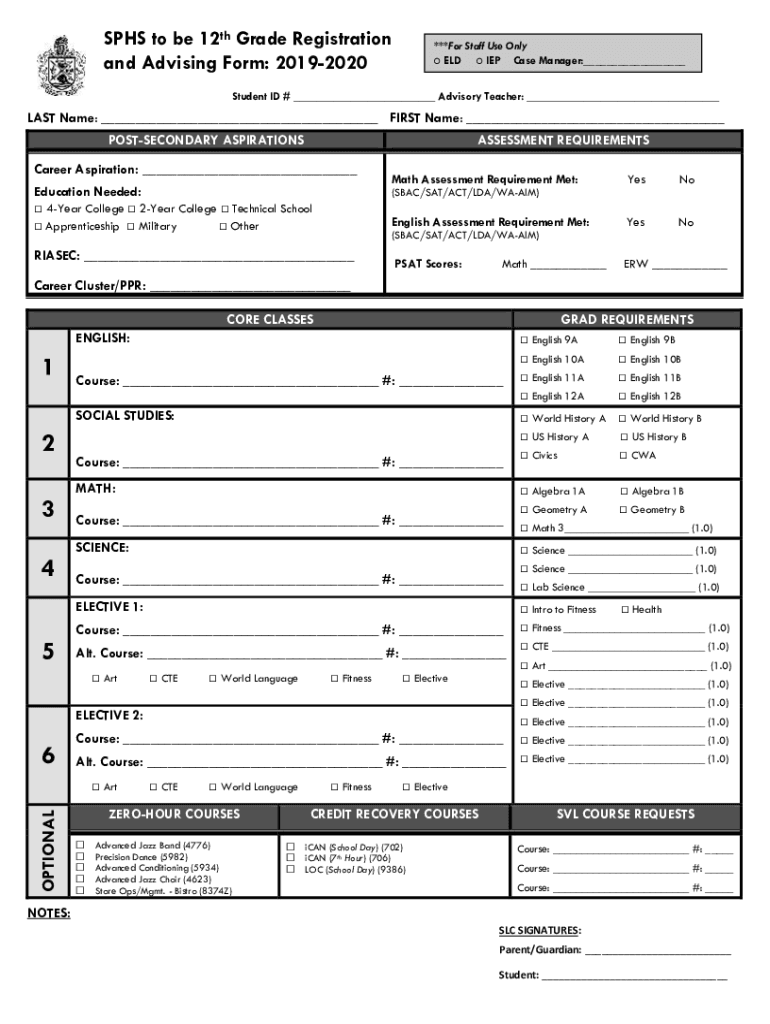 SPAS to be 12th Grade Registration and Advising Form: 20192020***For Staff Use Only ELD IEP Case Manager:___Student ID # ___ Advisory Teacher: ___LAST Name: ___ FIRST Name: ___ POSTSECONDARY ASPIRATIONSASSESSMENT